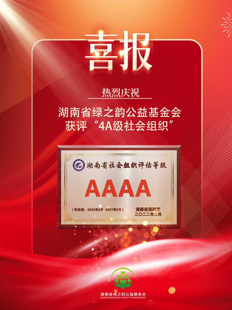 2022年3月9日,湖南省社會組織等級評估授牌大會在長沙召開。根據(jù)民政部《社會組織評估管理辦法》、《湖南省社會組織評估管理辦法》有關(guān)規(guī)定,社會組織等級評估從基礎(chǔ)條件、內(nèi)部治理、工作績效、黨建工作和社會評價五個方面對申報單位進行綜合考評,經(jīng)專家組實地考察、現(xiàn)場交流、意見反饋、資料核查、網(wǎng)上公示等程序,最終確定評估等級。湖南省綠之韻公益基金會獲評“4A級社會組織”。