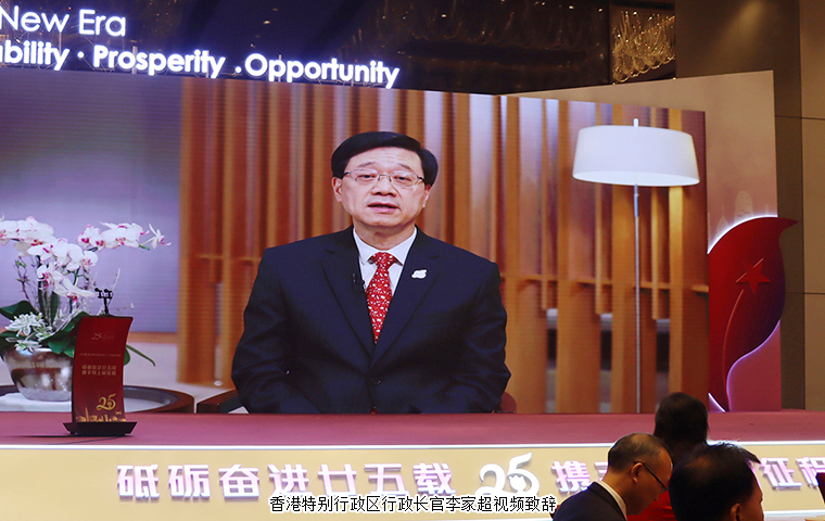 晚宴伊始,香港特別行政區(qū)行政長官李家超作視頻致辭。李家超對長期以來致力于香港繁榮穩(wěn)定和港湘交流發(fā)展的各界朋友表示衷心感謝。他指出,25年來,在祖國全力支持下,在香港特別行政區(qū)政府和社會各界共同努力下,“一國兩制”實踐在香港取得舉世公認(rèn)的成功。香港與內(nèi)地淵源深厚,在經(jīng)貿(mào)合作方面尤其緊密。未來五年是香港由治及興的關(guān)鍵時期。特區(qū)政府會務(wù)實有為,發(fā)展經(jīng)濟(jì),改善民生,積極融入國家發(fā)展大局,全面提升國際競爭力,團(tuán)結(jié)各界,同為香港開新篇。