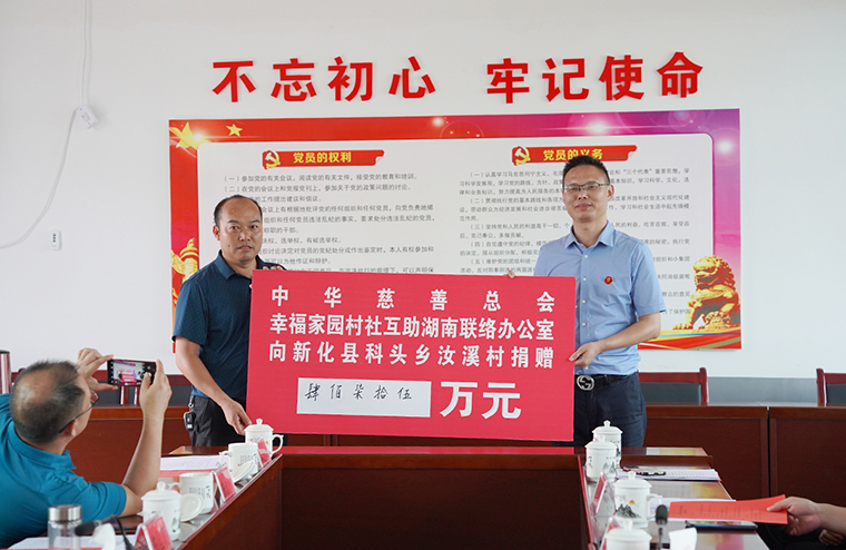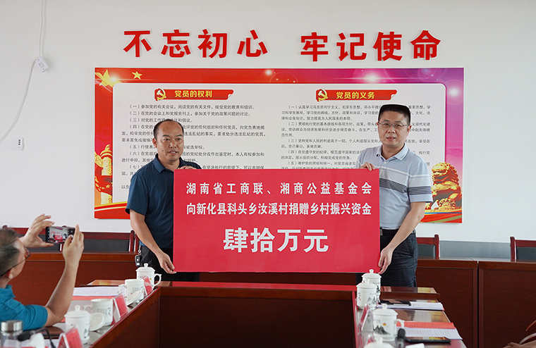9月20日下午,在汝溪村召開了省工商聯(lián)對口幫扶新化縣鄉(xiāng)村振興座談會,了解新化縣貫徹全國、全省“萬企興萬村”行動推進會精神落實情況,聽取新化縣委、縣政府以及省工商聯(lián)駐縣工作組、駐汝溪工作隊的有關(guān)工作匯報。現(xiàn)場進行了公益捐贈和項目簽約,湘商公益基金會、綠之韻集團分別為汝溪村捐贈鄉(xiāng)村振興幫扶資金40萬元、13.5萬元,中華慈善總會幸福家園村社互助湖南聯(lián)絡辦公室向科頭鄉(xiāng)捐贈了一批價值475萬元的醫(yī)療設(shè)備,懷化正好制藥有限公司與汝溪村的廣東紫珠項目進行現(xiàn)場簽約。