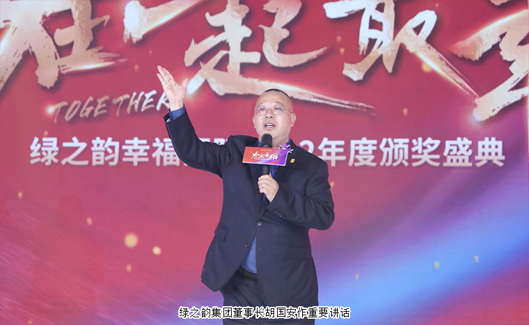 “路雖遠(yuǎn),行必至,事雖難,做必成”,大會(huì)最后,在全場最為熱烈的掌聲中,綠之韻集團(tuán)董事長胡國安上臺(tái)向所有幸福代言人贈(zèng)寄語牌匾,并講話。他首先向大會(huì)現(xiàn)場以及通過在線互動(dòng)視頻觀看本次大會(huì)盛況的綠之韻家人致以熱烈的歡迎和誠摯的問候,并向每一位獲獎(jiǎng)?wù)弑硎緹崃业淖YR。他表示,感謝每一位奮斗的幸福代言人,三年來,你們不畏艱難、不辭辛勞、不懼疫情,用不同形式,在不同地點(diǎn),全力的傳播著公司的企業(yè)文化,傳承中華五千年養(yǎng)生文化,積極推動(dòng)科技讓中醫(yī)養(yǎng)生走進(jìn)千家萬戶的理念,為你們點(diǎn)贊!向所有的幸福代言人致敬!你們奮斗的身影,是2022最美的風(fēng)景!回看來路,繁花似錦;瞻望前程,乘風(fēng)鼓翼。乘著黨的二十大與兩會(huì)勝利召開的浩蕩東風(fēng),我們滿懷激情的跨入充滿希望的2023年。在一起,最幸福,伴著市場環(huán)境加速回暖、營商環(huán)境持續(xù)優(yōu)化的鏗鏘足音,未來三年,在集團(tuán)公司的全力支持下,在現(xiàn)場每一位和通過視頻收看的綠之韻家人的支持下,我們一定能在新起點(diǎn)上再創(chuàng)新輝煌!