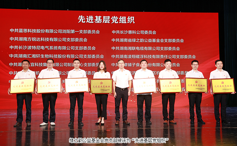 會(huì)上,瀏陽(yáng)經(jīng)開(kāi)區(qū)黨工委委員、管委會(huì)副主任何六生宣讀表彰文件。與會(huì)領(lǐng)導(dǎo)為獲得表彰的優(yōu)秀集體和個(gè)人頒獎(jiǎng)。綠之韻公益基金會(huì)黨支部憑借出色的黨建工作被中共瀏陽(yáng)經(jīng)濟(jì)技術(shù)開(kāi)發(fā)區(qū)工作委員會(huì)評(píng)為“先進(jìn)基層黨組織”;綠之韻集團(tuán)常務(wù)副總裁、綠之韻國(guó)際大酒店黨支部書(shū)記胡均安被評(píng)為“優(yōu)秀黨務(wù)工作者”;黨員楊丹、陳建新被評(píng)為“優(yōu)秀共產(chǎn)黨員”。