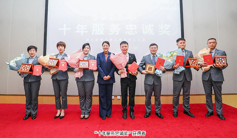 青春因磨礪而出彩,生命因奮斗而升華。在綠之韻有這樣一群人,他們堅(jiān)守崗位,練就強(qiáng)硬本領(lǐng);他們兢兢業(yè)業(yè),盡職盡責(zé);他們緊跟領(lǐng)導(dǎo)思想步伐,譜寫著綠之韻的春華秋實(shí),以向上的力量激勵(lì)不斷向前。為表彰先進(jìn)、樹立良好的榜樣,在萬眾期待下,公司為李思、張艷琴、梁淑琳、王壯、董進(jìn)、張宇航、周芳、黃茜、謝芬、羅瓊蕾頒發(fā)了“杰出青年人才獎(jiǎng)”;為董進(jìn)、謝芬、周鈺青、周繼武、虞曉娟、李軍、楊應(yīng)平、朱妹芳、羅永帥頒發(fā)了“五年服務(wù)英才獎(jiǎng)”;為張雅麗、程瑤、尹天弈、楊邢軒、賀煒、張智皓、顏洋頒發(fā)了“十年服務(wù)忠誠獎(jiǎng)”。綠之韻集團(tuán)總裁勞嘉、常務(wù)副總裁胡均安分別為獲獎(jiǎng)員工頒發(fā)獎(jiǎng)?wù)屡c榮譽(yù)證書,并致以熱烈祝賀。“五年服務(wù)英才獎(jiǎng)”代表董進(jìn)和“十年服務(wù)忠誠獎(jiǎng)”代表賀煒分別發(fā)表獲獎(jiǎng)感言,栩栩講述他們與綠之韻之間的動(dòng)人故事。