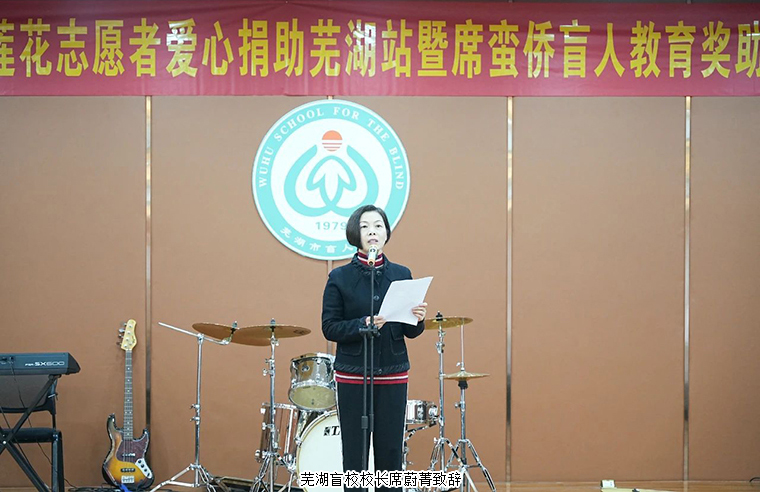 校長席蔚菁先后榮獲蕪湖市“優(yōu)秀園丁”、“優(yōu)秀校長”,安徽省“優(yōu)秀民辦學校校長”光榮稱號。在活動開始為大家講述了盲校的由來和初心,讓我們更能深入了解,幫困助學。