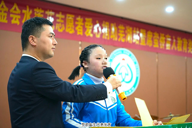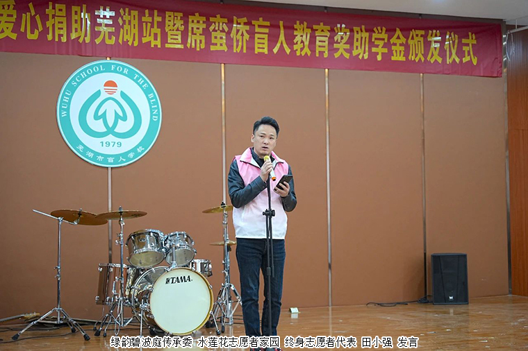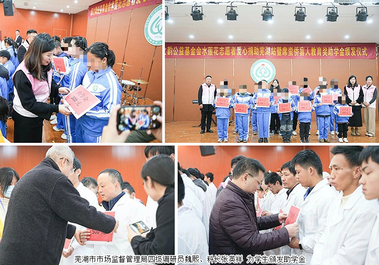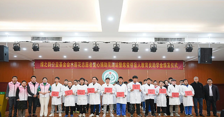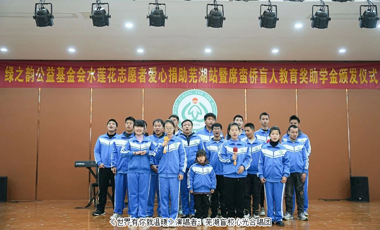 綠之韻水蓮花公益專項基金愛心捐助2023年度蕪湖盲校席蠻僑盲人教育助學金共30000元,以及10000元樂器和5000元的零食禮包。
