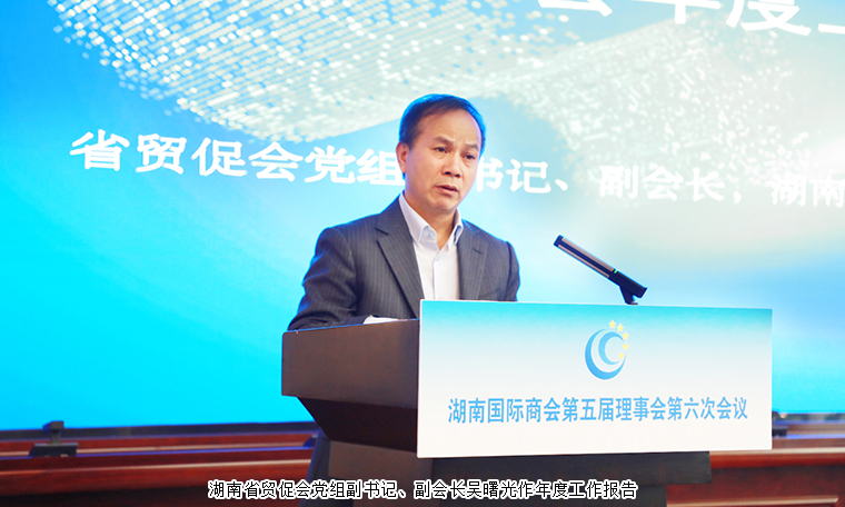 2023年12月28日,湖南國際商會第五屆理事會第六次會議在長沙召開。大會播放了習(xí)近平主席在慶祝中國國際貿(mào)易促進(jìn)委員會建會70周年大會暨全球貿(mào)易投資促進(jìn)峰會上的致辭視頻,審議了湖南國際商會2023年工作報(bào)告等多項(xiàng)事宜。湖南省貿(mào)促會黨組副書記、副會長吳曙光,湖南省貿(mào)促會黨組成員、副會長傅丹舟、鄧羅興及省貿(mào)促會一級巡視員余炳銳等領(lǐng)導(dǎo)出席會議。湖南省貿(mào)促會、湖南國際商會秘書長張乾勇主持會議。中國國際商會湖南商會副會長、湖南省慈善總會副會長、綠之韻集團(tuán)董事長胡國安受邀參加會議。