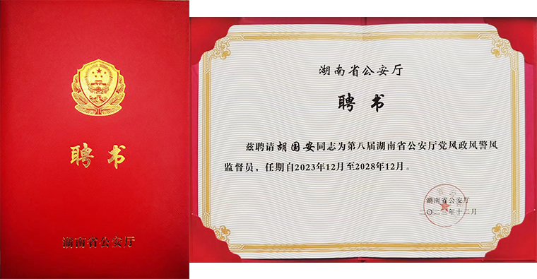 再次被受聘為湖南省公安廳黨風(fēng)政風(fēng)警風(fēng)監(jiān)督員,胡國安董事長深感責任重大。他表示,一直以來,他對監(jiān)督員的身份始終葆有一種神圣的使命感和責任感。這份聘書是沉甸甸的,不僅是一種光榮,更肩負著廣大普通民眾的矚托。未來,他一定不辜負湖南省公安廳黨委的期望,不辜負廣大民眾的重托,依法依規(guī)行使監(jiān)督員的職責,當好人民的“調(diào)研員”,深入調(diào)研了解廣大群眾對公安工作的意見和建議;當好人民的“查糾員”,行使好監(jiān)督員的群眾監(jiān)督作用;當好人民的“參謀員”,向公安機關(guān)傳送群眾的呼聲和期盼、積極建言獻策;當好人民的“宣傳員”,幫助講好警察故事,積極引導(dǎo)社會各界理解、支持公安工作,為形成人人遵法守法、自覺配合執(zhí)法的良好社會氛圍,助力全省公安工作現(xiàn)代化貢獻出自己的一份力量。