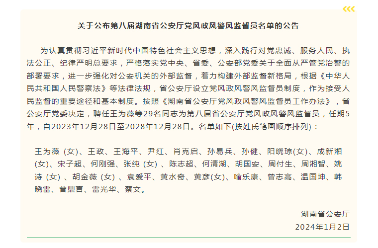 2024年1月2日,湖南省公安廳召開第八屆黨風(fēng)政風(fēng)警風(fēng)監(jiān)督員聘任會議。旨在深入貫徹黨中央和省委、公安部全面從嚴管黨治警決策部署,全面總結(jié)第七屆省公安廳特邀監(jiān)督員工作,部署推進第八屆省公安廳黨風(fēng)政風(fēng)警風(fēng)監(jiān)督員工作,全面加強外部監(jiān)督,助推全省公安工作現(xiàn)代化。公安部監(jiān)督員、湖南省人民醫(yī)院常務(wù)副院長向華,湖南省公安廳黨委副書記、常務(wù)副廳長周賽保,湖南省紀委駐公安廳紀檢監(jiān)察組組長、湖南省公安廳黨委委員段國華出席會議,周賽保為監(jiān)督員頒發(fā)聘書并講話。湖南省公安廳黨委委員、政治部主任余良勇主持會議。湖南省公安廳交警總隊總隊長、一級警務(wù)專員蔣建湘,經(jīng)偵總隊總隊長、一級警務(wù)專員石敏初,特勤局政委栗民軒,湖南省紀委駐公安廳紀檢監(jiān)察組副組長宋紅兵,長沙鐵路公安處處長董延?xùn)|,刑偵總隊總隊長敖平洋,網(wǎng)技總隊總隊長雷衛(wèi)軍等參加會議。全國政協(xié)委員、湖南啟元律師事務(wù)所首席合伙人袁愛平,湖南省人大代表、中南大學(xué)湘雅醫(yī)院院長雷光華,長沙市人大代表、湖南省海外聯(lián)誼會副會長、綠之韻集團董事長胡國安等受邀參加會議,并受聘為第八屆湖南省公安廳黨風(fēng)政風(fēng)警風(fēng)監(jiān)督員。