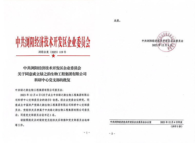 為貫徹落實(shí)黨的二十大精神,進(jìn)一步加強(qiáng)基層黨組織建設(shè),以黨建工作引領(lǐng)科研技術(shù)攻關(guān),充分發(fā)揮黨建工作對(duì)企業(yè)的引領(lǐng)作用,經(jīng)中共瀏陽(yáng)經(jīng)濟(jì)技來(lái)開(kāi)發(fā)區(qū)企業(yè)委員會(huì)批復(fù)同意,中共綠之韻生物工程集團(tuán)有限公司科研中心黨支部正式成立,賀煒同志當(dāng)選為黨支部委員會(huì)書(shū)記。