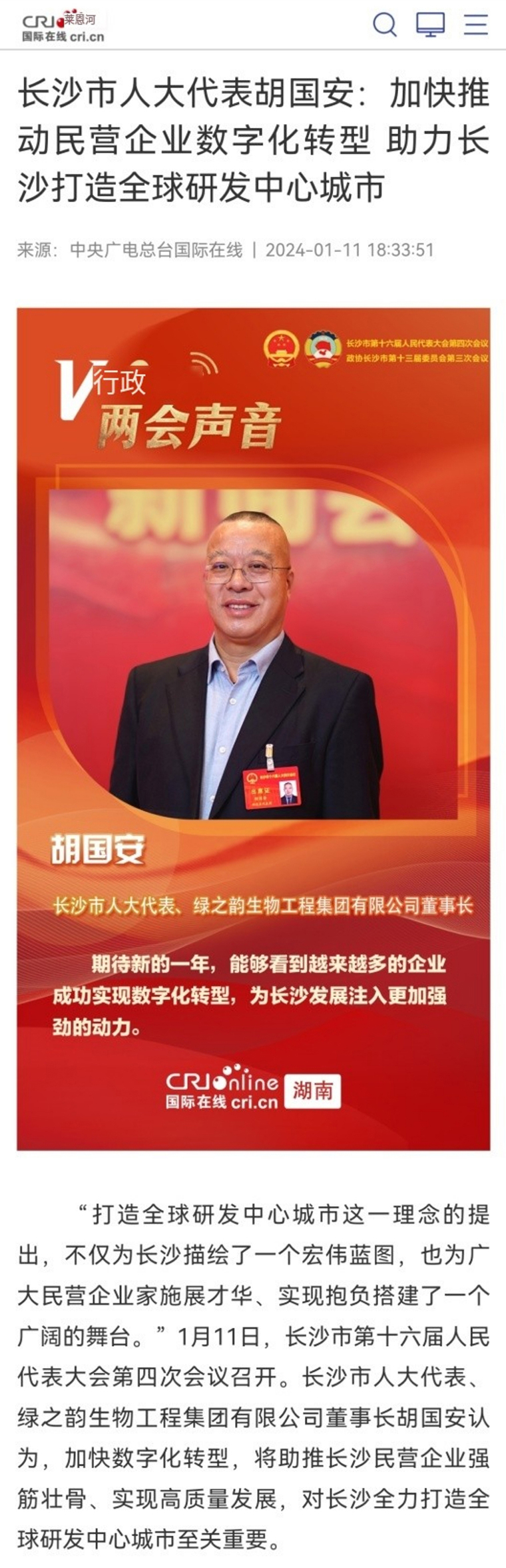 闊步新征程,建功新時(shí)代!2023年是全面貫徹黨的二十大精神的開局之年,也是三年新冠疫情防控轉(zhuǎn)段后經(jīng)濟(jì)恢復(fù)發(fā)展的一年。這一年以來,胡國安代表在市人大及其常委會(huì)領(lǐng)導(dǎo)下,積極參加長沙市人大“鄉(xiāng)村振興長沙行”、“長株潭交通一體化規(guī)劃與重點(diǎn)項(xiàng)目”、“聚焦強(qiáng)省會(huì)戰(zhàn)略,助推高質(zhì)量發(fā)展”、“平安建設(shè)”等重點(diǎn)項(xiàng)目調(diào)研和視察活動(dòng),踐行了“人民選我當(dāng)代表、我當(dāng)代表為人民”的莊嚴(yán)承諾。2024年是中華人民共和國成立75周年,是人民代表大會(huì)制度建立70周年,是實(shí)施 “十四五”規(guī)劃的關(guān)鍵一年,是長沙現(xiàn)代化征程戰(zhàn)略深入推進(jìn)的關(guān)鍵發(fā)展時(shí)期。作為在長沙這片沃土上成長起來的民營企業(yè),綠之韻將認(rèn)真貫徹落實(shí)今年長沙“兩會(huì)”精神指示,準(zhǔn)確把握所處發(fā)展階段,奮力擔(dān)當(dāng)歷史使命,穩(wěn)住向上向好發(fā)展態(tài)勢,全領(lǐng)域、全方位、全過程貫徹高質(zhì)量的發(fā)展要求,深入推進(jìn)“大品牌+大健康+大金融”的發(fā)展戰(zhàn)略,聚焦實(shí)業(yè),做精主業(yè),更加注重發(fā)展方式綠色轉(zhuǎn)型,更加注重激發(fā)干事創(chuàng)業(yè)活力,積極承擔(dān)企業(yè)公民責(zé)任,把企業(yè)發(fā)展腳步與鄉(xiāng)村振興工作進(jìn)行有效銜接,緊緊圍繞全面落實(shí)“三高四新”戰(zhàn)略定位和使命任務(wù),創(chuàng)新實(shí)干,勇毅前行,為建設(shè)現(xiàn)代化新長沙作出更大的貢獻(xiàn)!