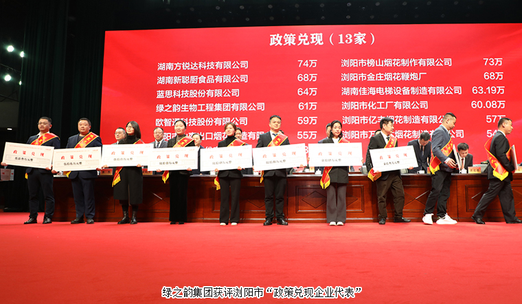 會上,中共瀏陽市委副書記、統(tǒng)戰(zhàn)部部長戴武明宣讀了《關(guān)于對瀏陽市獲得國務(wù)院、國家部委榮譽,受到省人民政府、長沙市人民政府2023年度真抓實干督查激勵單位予以表揚的通報》《關(guān)于表彰瀏陽市“創(chuàng)新實干 擔(dān)當(dāng)有為”先進集體和先進個人的決定》和《關(guān)于2023年度縣域經(jīng)濟高質(zhì)量發(fā)展政策兌現(xiàn)的通知》。大會舉行了企業(yè)政策兌現(xiàn)和優(yōu)秀企業(yè)家、民營經(jīng)濟高質(zhì)量發(fā)展先進個人授牌儀式。表揚和表彰獎勵了2023年經(jīng)濟社會發(fā)展中涌現(xiàn)出的先進集體、個人和優(yōu)秀企業(yè)代表。綠之韻生物工程集團有限公司獲瀏陽市“政策兌現(xiàn)”表彰、胡國安董事長榮獲瀏陽市“民營經(jīng)濟高質(zhì)量發(fā)展先進個人”、胡均安常務(wù)副總裁榮獲瀏陽市“優(yōu)秀企業(yè)家”。