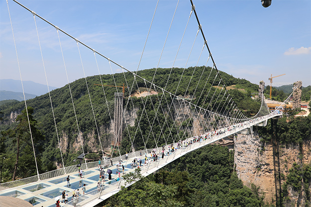 張家界大峽谷玻璃橋又名“云天渡”,有著"天橋合一,以渡天下之人"的美譽(yù),是一座全透明玻璃景觀橋梁,兼具景區(qū)行人通行、游覽、蹦極、溜索、T臺(tái)等功能,也是世界最高最長的斜拉式高山峽谷玻璃橋。在云霧之間,大橋宛如千尺白綾在其中若隱若現(xiàn),一踏上橋面便從山水之中突然超脫出山水之外。綠之韻家人們漫步在玻璃橋,輕吻藍(lán)天白云,渡過峽谷從橋這頭走到那頭,仿佛也將家人們的心渡得更加接近。