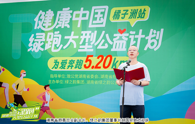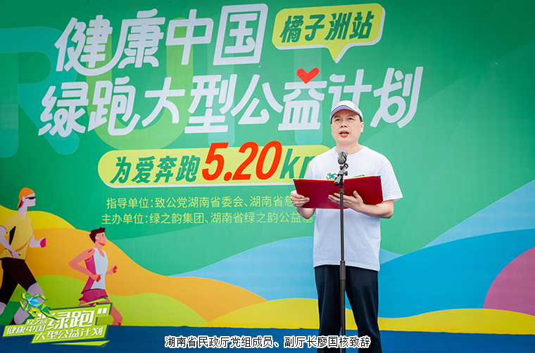 湖南省民政廳黨組成員、副廳長廖國核致辭。他表示,今天,我們以愛之名、善之行,共同參與、共同見證、共同推進(jìn)2024綠之韻“健康中國—綠跑”大型公益活動(dòng)。湖南省慈善總會(huì)聯(lián)合綠之韻集團(tuán)共同舉辦“綠跑活動(dòng)”,倡導(dǎo)人人慈善的理念,踐行綠色發(fā)展理念,將“健康”與“公益”相結(jié)合,將“惠己”與“助人”相結(jié)合,激發(fā)向善向上正能量,凝聚社會(huì)公益心。綠跑已經(jīng)持續(xù)舉辦了9屆,每一屆都設(shè)定了不同的公益主題、吸引了公眾廣泛參與、匯聚了強(qiáng)大的慈善力量、展現(xiàn)了湖南的人文新貌。綠之韻集團(tuán)自成立以來,堅(jiān)守“讓善行成為生命習(xí)慣”的理念,主動(dòng)承擔(dān)社會(huì)責(zé)任,致力于傳遞愛的力量,為湖南慈善事業(yè)做出了積極貢獻(xiàn)。綠之韻發(fā)起的“綠跑活動(dòng)”,充分體現(xiàn)了綠之韻優(yōu)秀的企業(yè)文化和強(qiáng)烈的社會(huì)擔(dān)當(dāng)。希望大家能跑出健康的身體,跑出幸福的人生,跑出愛心的力量,跑出文明的風(fēng)景,讓奔跑的身影成為橘子洲頭最生動(dòng)的景致,讓大家奉獻(xiàn)的善舉成為山水洲城最美好的畫卷。