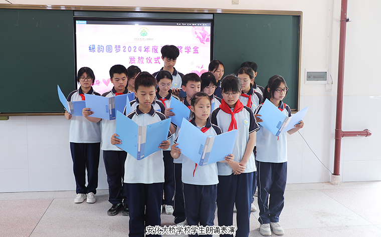 安化縣大橋?qū)W校校長(zhǎng)黃軍致歡迎辭。他首先代表學(xué)校對(duì)一直大力支持教育事業(yè)的綠之韻集團(tuán)愛心團(tuán)隊(duì)表示衷心的感謝。他表示,多年來,胡國(guó)安董事長(zhǎng)帶領(lǐng)的愛心企業(yè)綠之韻不僅為我校捐贈(zèng)了愛心校車和大量的圖書,還改善了食堂的用餐環(huán)境,2023年設(shè)立了“綠韻圓夢(mèng)獎(jiǎng)教助學(xué)基金”,為品學(xué)兼優(yōu)的師生提供了寶貴的支持和激勵(lì),極大地激發(fā)了師生們的學(xué)習(xí)熱情和創(chuàng)新精神。未來,全體師生將秉承“傳遞希望之火”的精神,將這份關(guān)愛和溫暖傳遞給更多的人。隨后,獲得獎(jiǎng)教獎(jiǎng)學(xué)金的學(xué)生代表上臺(tái)進(jìn)行主題詩歌朗誦,表達(dá)內(nèi)心的感激之情。