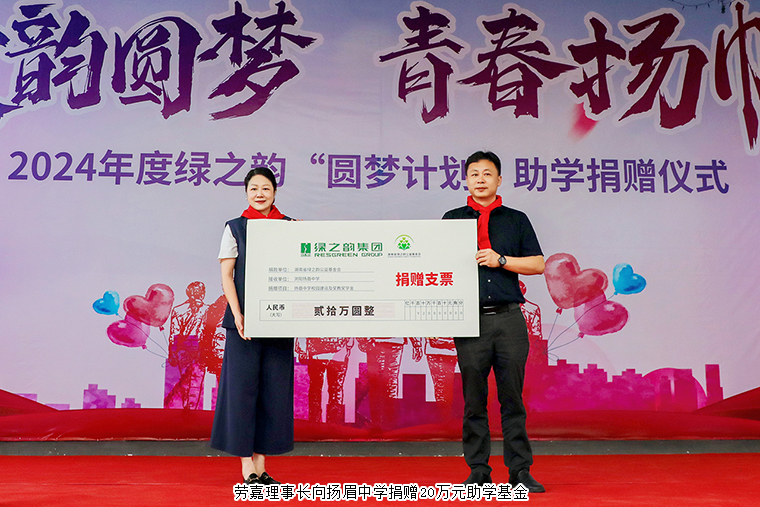 勞嘉理事長表示,捐資助學(xué)是善舉,興學(xué)育人是美德。教育幫扶一直是綠之韻公益基金會(huì)的重要關(guān)注點(diǎn)之一。綠之韻成立21年來,在胡國安董事長的倡導(dǎo)下,始終堅(jiān)持承擔(dān)社會(huì)責(zé)任,堅(jiān)守“讓善行成為生命習(xí)慣 ”的理念,致力于傳遞愛的力量。在綠之韻第五個(gè)五年規(guī)劃發(fā)展時(shí)期,集團(tuán)捐贈(zèng)1000萬設(shè)立“綠韻圓夢(mèng)”愛心基金。此次捐資20萬用于幫助揚(yáng)眉中學(xué)少年宮文化建設(shè)和設(shè)立助學(xué)助教獎(jiǎng)學(xué)金便是我們“綠韻圓夢(mèng)”行動(dòng)重要的實(shí)踐之一。未來,我們還希望影響和帶動(dòng)更多有愛心的人士參與到捐資助學(xué)行動(dòng)中來,幫助青少年健康成長,為瀏陽教育事業(yè)高質(zhì)量發(fā)展作出積極貢獻(xiàn)。