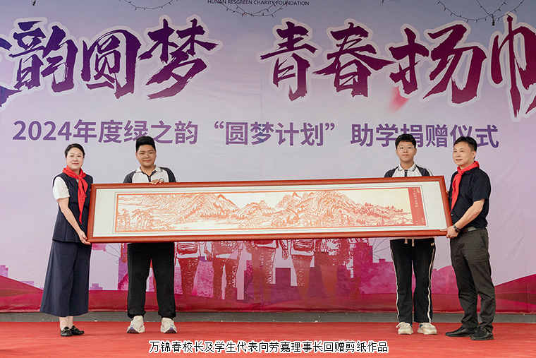 在“綠韻圓夢(mèng)”捐贈(zèng)儀式上,勞嘉理事長向揚(yáng)眉中學(xué)捐贈(zèng)20萬元助學(xué)基金,萬錦春校長及學(xué)生代表向勞嘉理事長回贈(zèng)剪紙作品《富春山居圖》,以表達(dá)對(duì)綠之韻開展助學(xué)公益項(xiàng)目的認(rèn)可和感謝。