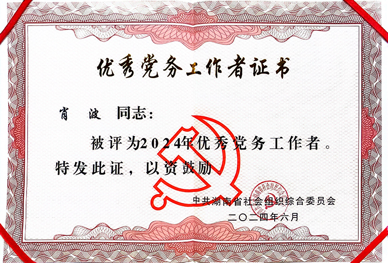 2024年6月27日,湖南省社會(huì)組織綜合黨委“七一”表彰暨省級(jí)社會(huì)組織評(píng)估等級(jí)授牌會(huì)議在長(zhǎng)沙召開。會(huì)議宣讀了《中共湖南省社會(huì)組織綜合委員會(huì)關(guān)于表彰先進(jìn)基層黨組織、優(yōu)秀共產(chǎn)黨和優(yōu)秀黨務(wù)工作者的決定》,對(duì)湖南省20個(gè)社會(huì)組織先進(jìn)基層黨組織、10名優(yōu)秀共產(chǎn)黨和10名優(yōu)秀黨務(wù)工作者予以表彰獎(jiǎng)勵(lì)。中共湖南省綠之韻公益基金會(huì)黨支部書記肖波獲評(píng)“中共湖南省社會(huì)組織綜合委員會(huì)優(yōu)秀黨務(wù)工作者”。