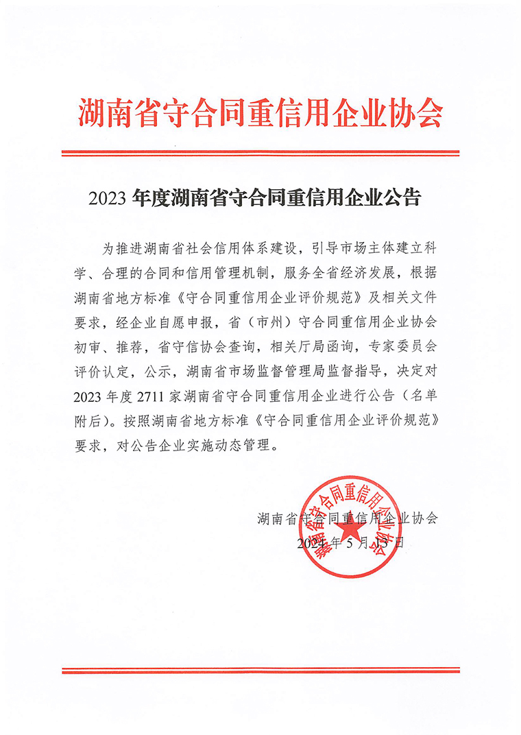 近日,湖南省守合同重信用企業(yè)協(xié)會、長沙市守合同重信用企業(yè)協(xié)會分別發(fā)布了《2023年度湖南省守合同重信用企業(yè)公告》《2023年度長沙市守合同重信用企業(yè)公告》。綠之韻集團憑借完善的企業(yè)誠信建設(shè)體系與科學(xué)的企業(yè)管理水平連續(xù)第16次榮登榜單,被授予“湖南省守合同重信用企業(yè)”“長沙市守合同重信用企業(yè)”榮譽稱號。