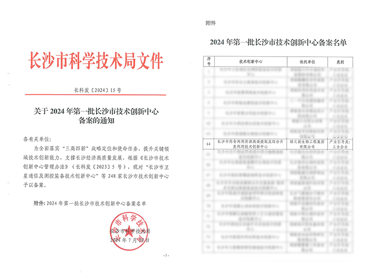 近日,根據(jù)《長沙市技術(shù)創(chuàng)新中心管理辦法》(長科發(fā)〔2023〕5號),經(jīng)宣傳發(fā)動、自愿申報、推薦部門推薦、專家評審、長沙市科學技術(shù)局黨組會研究、長沙市人民政府審定等程序,長沙市科學技術(shù)局對“2024年第一批長沙市技術(shù)創(chuàng)新中心”備案,綠之韻集團建設(shè)的“長沙市藥食兩用資源高效提取及綜合開發(fā)利用技術(shù)創(chuàng)新中心”成功入選。此次入選,是長沙市科學技術(shù)局對綠之韻集團的科技創(chuàng)新能力、研發(fā)團隊建設(shè)等方面的權(quán)威認可。