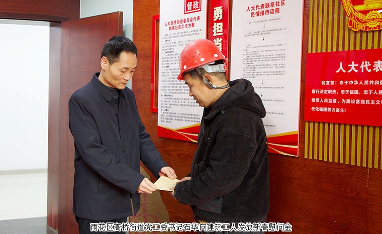 活動(dòng)現(xiàn)場(chǎng),雨花區(qū)高橋街道黨工委書記石華和人大代表們向建筑工人發(fā)放新春慰問(wèn)金。每一份慰問(wèn)金都飽含著對(duì)群眾的關(guān)心與祝福,傳遞著黨和政府對(duì)他們的深切關(guān)懷。工人們接過(guò)慰問(wèn)金,臉上也洋溢出溫暖的笑容。雨花區(qū)高橋街道黨工委書記石華表示,街道將繼續(xù)關(guān)注建筑工人的生活和工作情況,積極為他們解決實(shí)際問(wèn)題。同時(shí)也將加強(qiáng)與人大代表的溝通協(xié)作,共同推動(dòng)街道各項(xiàng)工作高質(zhì)量開展。