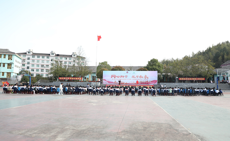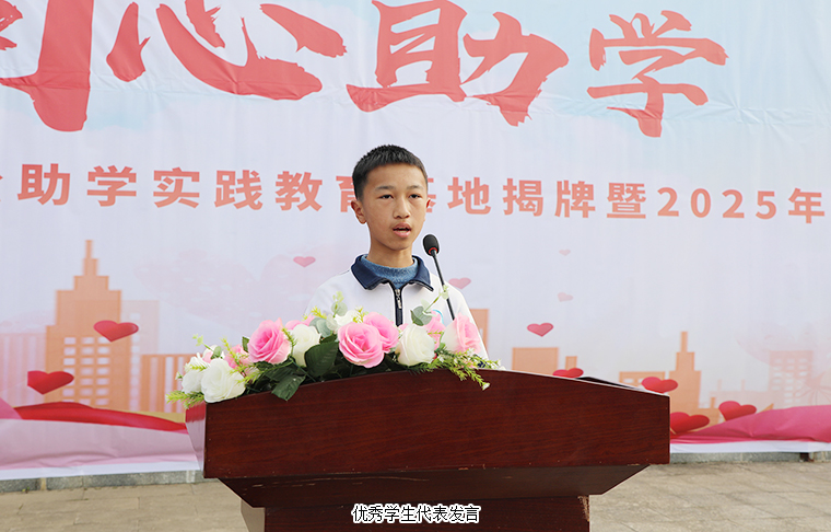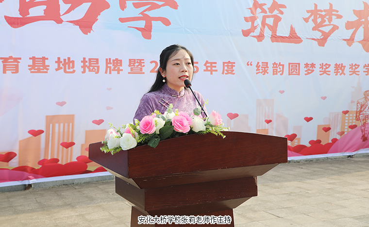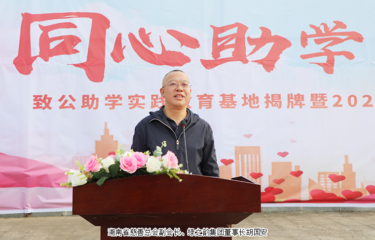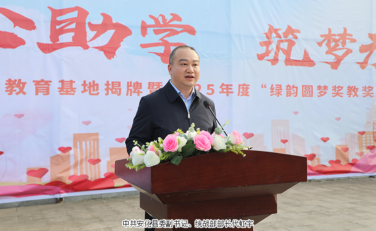 中共安化縣委副書記、統(tǒng)戰(zhàn)部部長代虹宇致歡迎辭。他首先對一直大力支持教育事業(yè)的綠之韻集團愛心團隊給予高度贊許。同時表示,2021年,致公黨湖南省委員會與我縣簽訂《助力鄉(xiāng)村振興戰(zhàn)略“致安合作”框架協(xié)議》,通過產業(yè)幫扶、教育助學、醫(yī)療義診等務實舉措,累計投入幫扶資金860萬元,實施項目 23個,為安化鄉(xiāng)村振興注入強勁動能。胡國安董事長設立“綠韻圓夢”獎教獎學金,已經連續(xù)三年每年向學校捐贈人民幣10萬元整,累計惠及師生420人次,彰顯了新時代企業(yè)家的教育情懷和責任擔當。安化大橋學校作為冷市鎮(zhèn)教育的窗口,近年來在各方支持下,辦學條件顯著改善,教學質量穩(wěn)步提升。今天實踐教育基地揭牌,既是總結更是啟航。期盼學校深化合作,在課程共建、師資培育等方面創(chuàng)新突破,打造鄉(xiāng)村教育振興示范樣本。希望同學們立鴻鵠志、做追夢人,將感恩之心轉化為“強國有我”的奮斗力量,讓青春在傳遞愛心中綻放光彩。讓我們以此次活動為新起點,凝聚各方力量,厚植教育情懷,持續(xù)推動城鄉(xiāng)教育優(yōu)質均衡發(fā)展,為鄉(xiāng)村振興培育更多生力軍。