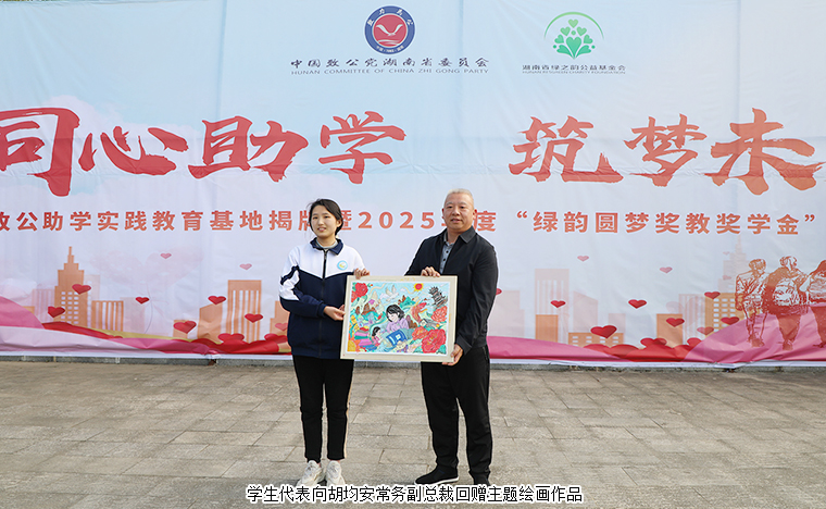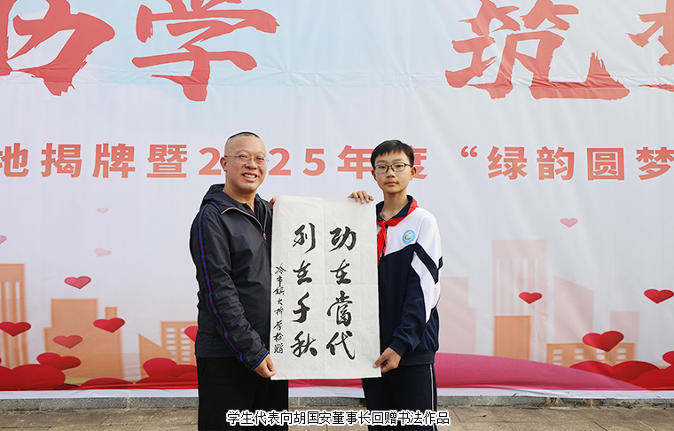 在全場領導嘉賓的見證下,湖南省人大常委會副主任、致公黨省委會主委胡旭晟,中共安化縣委副書記、統(tǒng)戰(zhàn)部部長代虹宇,冷市鎮(zhèn)中心學校校長張亮,綠之韻集團董事長胡國安共同為“致公助學實踐教育基地”揭牌,標志著安化大橋學校成為致公黨湖南省委會與綠之韻公益基金會教育幫扶的重要基地,助力安化縣實施鄉(xiāng)村振興文化振興、教育振興。學生代表向胡國安董事長、胡均安常務副總裁回贈了精心創(chuàng)作的書法及主題繪畫作品,筆觸間飽含感恩與感激之情。