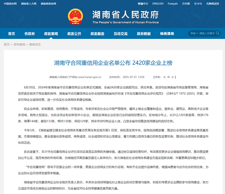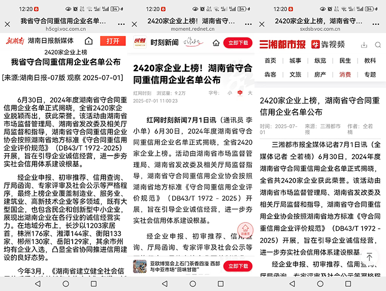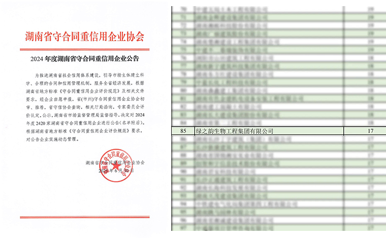 2025年6月,2024年度湖南省守合同重信用企業(yè)名單正式發(fā)布,新湖南、紅網(wǎng)、三湘都市報(bào)等相繼進(jìn)行了公示報(bào)道。綠之韻集團(tuán)憑借深入踐行的誠信理念、完善的合同信用管理體系和卓越的綜合管理水平,連續(xù)第十七年蟬聯(lián)“湖南省守合同重信用企業(yè)”與“長沙市守合同重信用企業(yè)”稱號。這份跨越十七載的持續(xù)認(rèn)可,有力印證了綠之韻將誠信視為企業(yè)生命線、融入發(fā)展血脈的長期堅(jiān)守。