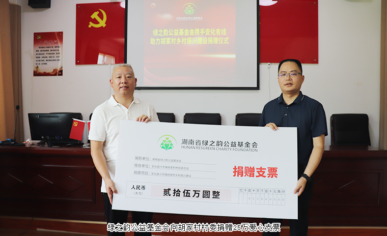捐贈儀式現(xiàn)場暖意融融,綠之韻集團常務(wù)副總裁胡均安代表綠之韻公益基金會向胡家村村委遞上25萬元愛心支票;湖南有線安化網(wǎng)絡(luò)有限公司董事長陳社平亦向村委捐贈20萬元愛心款,兩份沉甸甸的善意凝聚著對鄉(xiāng)村發(fā)展的深切關(guān)懷。安化縣人大常委會黨組書記陳飛燕和安化縣人大常委會辦公室主任劉建輝代表受助方回贈愛心牌匾,以作銘記與致謝。“捐資助學(xué)潤桃李,鄉(xiāng)村振興報桑梓”這句飽含溫度的話語,正是胡家村全體村民對綠之韻等愛心力量善舉的最誠摯回響。