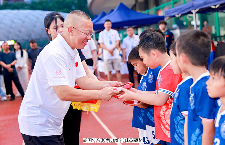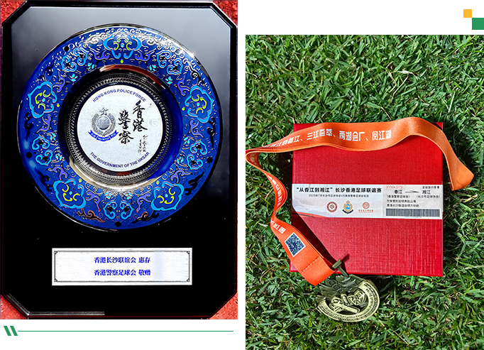 當(dāng)晚,少兒組賽事頒獎環(huán)節(jié)如期舉行。胡國安會長為 U6 組小球員頒獎,在工作人員引領(lǐng)下,他親手將獎牌和紀(jì)念品送到孩子們手中,并親切合影。隨后,香港警察足球會主席陳憲鈞向長沙市海外聯(lián)誼會、香港長沙聯(lián)誼會、長沙足協(xié)贈送紀(jì)念品,進(jìn)一步增進(jìn)了兩地足球界情誼,為湘粵港澳交流添上濃厚一筆。