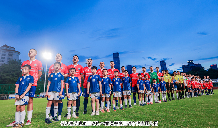 19:30,長沙精英聯(lián)盟足球隊VS香港警察足球會代表團(tuán)入場式拉開帷幕。國旗飄揚(yáng)中,球員們牽著球童步入賽場,莊嚴(yán)的國歌奏響,現(xiàn)場氛圍莊重?zé)崃?。長沙市海外聯(lián)誼會會長劉匯在長沙市足協(xié)主席魏華松陪同下,與首發(fā)球員親切握手并為本場比賽開球,隨著足球踢出,這場備受矚目的比賽正式開啟。