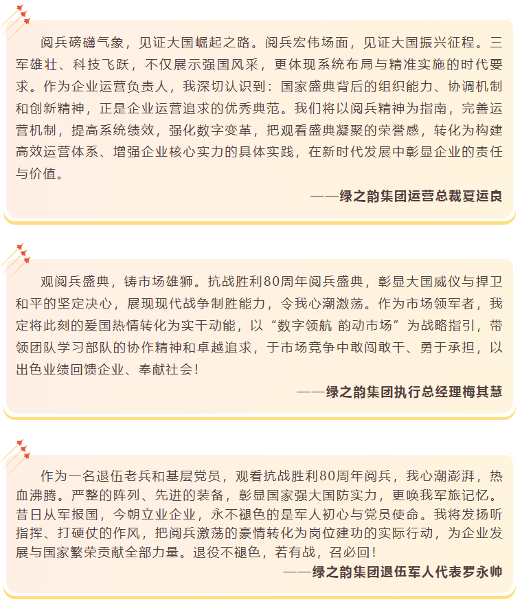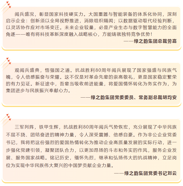 致敬偉大勝利,汲取奮進力量。綠之韻集團董事長胡國安在觀看閱兵儀式后表示,閱兵儀式展現(xiàn)的大國風(fēng)范和民族精神,正是綠之韻22年來砥礪前行的力量源泉。站在歷史與未來的交匯點,我們要更加深刻認識到企業(yè)發(fā)展與國家命運息息相關(guān)。觀看閱兵儀式是一次深刻的愛國主義教育和精神洗禮,抗戰(zhàn)精神是企業(yè)發(fā)展不可或缺的精神財富。通過此次觀閱活動,希望全體綠之韻人要進一步汲取歷史智慧、錘煉政治品格,將閱兵儀式所展現(xiàn)的團結(jié)奮進、自強不息的精神轉(zhuǎn)化為推動企業(yè)創(chuàng)新發(fā)展的實際行動。未來,綠之韻集團將繼續(xù)深化黨建與企業(yè)發(fā)展同頻共振,引領(lǐng)公司在新時代征程中踐行社會責(zé)任、展現(xiàn)企業(yè)擔(dān)當(dāng),為實現(xiàn)中華民族偉大復(fù)興貢獻力量。