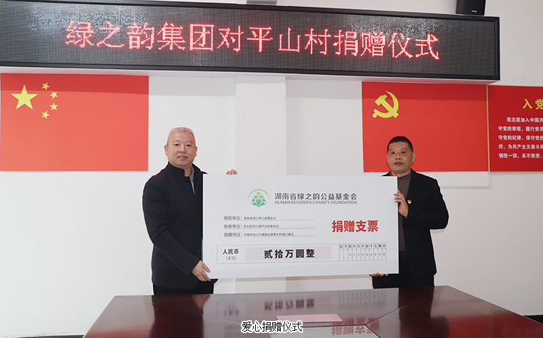 隨后的捐贈儀式上,綠之韻集團(tuán)常務(wù)副總裁胡均安代表基金會向平山村捐贈20萬元愛心支票用于支持村級公共基礎(chǔ)設(shè)施建設(shè)。平山村黨支部書記梁建雄代表全村接收捐贈,并向綠之韻回贈了飽含感激之情的愛心錦旗。胡均安常務(wù)副總裁表示,作為一名安化籍企業(yè)家,同時(shí)也是一名安化縣人大代表,積極投身到建設(shè)家鄉(xiāng)的事業(yè)中去,是他與生俱來的責(zé)任與使命。綠之韻先后在安化投資建設(shè)黃精、杜仲等中藥材種植基地,捐建水電、道路、橋梁、生活廣場等硬件設(shè)施,為老人、婦女進(jìn)行免費(fèi)的兩癌篩查,為學(xué)校捐建校車、圖書、體育設(shè)備,為孩子們設(shè)立獎教獎學(xué)金,累計(jì)捐贈款物1000多萬,全方位支持家鄉(xiāng)鄉(xiāng)村振興建設(shè)、文化教育事業(yè)發(fā)展。今年5月20日,綠之韻集團(tuán)在長沙人文地標(biāo)橘子洲舉行3000人綠跑大型公益品牌活動,現(xiàn)場捐贈100余萬元愛心款項(xiàng)至綠韻圓夢公益項(xiàng)目。其中,捐贈20萬用于平口鎮(zhèn)平山村村級公共設(shè)施項(xiàng)目建設(shè),促進(jìn)鄉(xiāng)村振興建設(shè)及當(dāng)?shù)亟?jīng)濟(jì)發(fā)展,提高家鄉(xiāng)人民的幸福感、獲得感、滿足感。此次,帶領(lǐng)綠之韻集團(tuán)黨委一行來到安化共聯(lián)共建,也希望盡己所能,將企業(yè)發(fā)展成果惠及家鄉(xiāng)人民,為建設(shè)新時(shí)代高質(zhì)量、富饒美麗的安化貢獻(xiàn)一份力量。