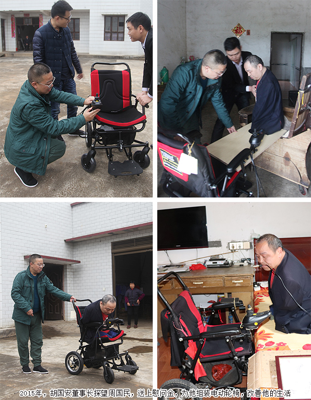 書桌前畫畫、寫字磨過了他大半輩子的時光,四季輪回更迭,周國民愈加向往外面的世界,渴望更真實地去感受陽光和風(fēng),渴望與更多人交流,感受這個世界的溫度。2015年11月,綠之韻公益基金會得知這一情況,為周國民送去了電動輪椅。胡國安董事長親自去探望周國民,將輪椅組裝好,并耐心指導(dǎo)他使用,圓了他的自由行動夢。