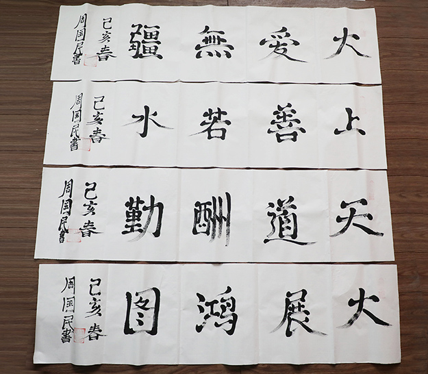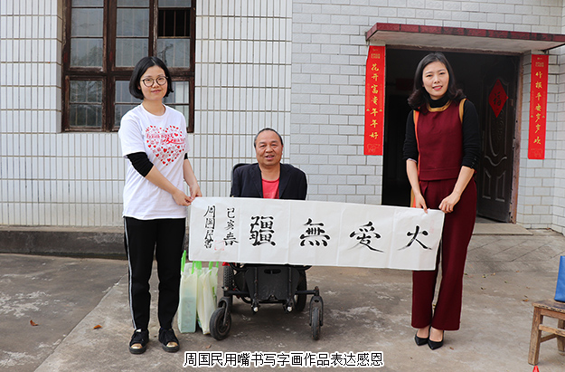 “感謝五年前胡國安董事長的鼓勵,現(xiàn)在我用嘴寫的書畫作品已經(jīng)成熟很多,我想為胡國安董事長送去我的字畫,表達(dá)我的感謝與感激。”上善若水、大愛無疆、大展鴻圖、大道酬勤……一幅幅字畫都是周國民的心聲。綠之韻公益基金會秘書長蔣文代表胡國安董事長接過這份沉甸甸的心意禮物,并在了解周國民現(xiàn)在家中80多歲的老父親已經(jīng)中風(fēng)偏癱,母親年事已高但照顧著家中大小事情,不僅送去了慰問金和綠之韻生活用品,還專門購置了電飯煲、電磁爐和微波爐等電器,為周國民一家提供更多便利生活。