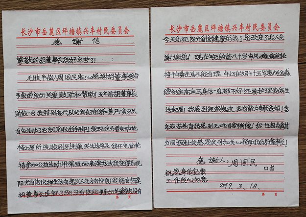 談起現(xiàn)在坐的這臺電動輪椅,周國民依然帶著興奮和雀躍。“一臺電動輪椅從此改變了我的人生,做夢都沒想到我可以開著電動輪椅自由活動,我重新獲得有手有腳的生活,電動輪椅就是我的手腳。以前我做任何事情都需要媽媽幫忙,現(xiàn)在媽媽年齡大了,我還能為媽媽做點力所能及的事。”周國民向綠之韻愛心志愿者展示他騎著電動輪椅自由活動的樣子,他始終記得胡國安董事長“自尊自強(qiáng),有志者事竟成”的關(guān)懷與鼓勵,坐著電動輪椅,他更積極參加社會活動,去各種活動現(xiàn)場用嘴書寫和畫畫,進(jìn)行愛心義賣。