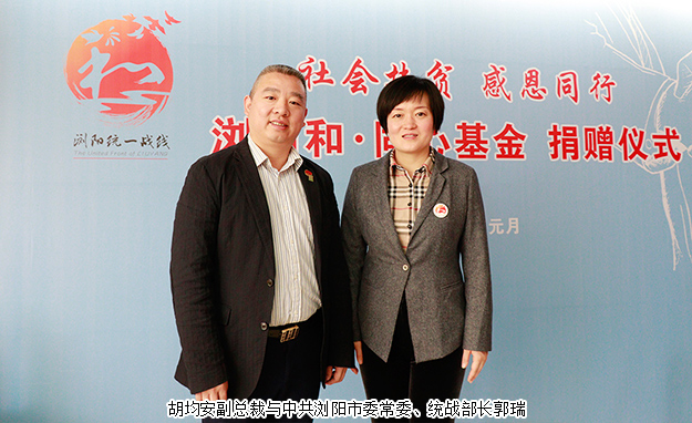 社會(huì)扶貧,感恩同行。2019年1月24日,“瀏陽和·同心基金”捐贈(zèng)座談會(huì)在瀏陽市舉行。中共瀏陽市委常委、統(tǒng)戰(zhàn)部長(zhǎng)郭瑞,瀏陽市人大常委會(huì)副主任、民革瀏陽工委主委劉仙娥,中共瀏陽市委統(tǒng)戰(zhàn)部常務(wù)副部長(zhǎng)焦清平,中共瀏陽市委統(tǒng)戰(zhàn)部副部長(zhǎng)、工商聯(lián)黨組書記湯建軍,瀏陽市安監(jiān)局黨組書記、局長(zhǎng)熊湘東,中共瀏陽市委統(tǒng)戰(zhàn)部副部長(zhǎng)、臺(tái)辦主任江涵等領(lǐng)導(dǎo)出席活動(dòng)。瀏陽市委統(tǒng)戰(zhàn)部、市安監(jiān)局、市工商聯(lián)、市紅十字會(huì)負(fù)責(zé)人等參加活動(dòng)。會(huì)上,“瀏陽和·同心基金”溫暖成立,綠之韻集團(tuán)捐資10萬為愛聚力,綠之韻集團(tuán)副總裁胡均安參加捐贈(zèng)儀式。