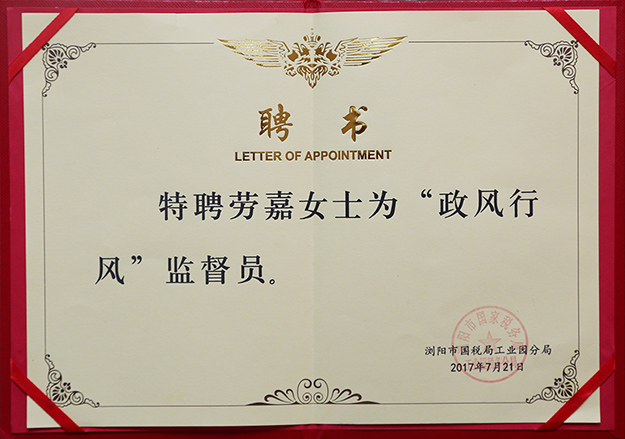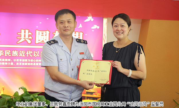 為了切實(shí)有效的加強(qiáng)政風(fēng)行風(fēng)建設(shè),提高依法治稅和為民服務(wù)的水平,瀏陽市國稅局工業(yè)園分局特聘綠之韻集團(tuán)董事、總裁勞嘉為“政風(fēng)行風(fēng)”監(jiān)督員,并由卜輝局長為勞嘉總裁頒發(fā)特聘證書。卜輝局長對(duì)勞嘉總裁表示祝賀并希望:關(guān)心國稅改革與發(fā)展,關(guān)注干部勤政與清廉,當(dāng)好稅風(fēng)監(jiān)督員、稅收宣傳員、稅情聯(lián)絡(luò)員,共同為國稅現(xiàn)代化事業(yè)保駕護(hù)航。