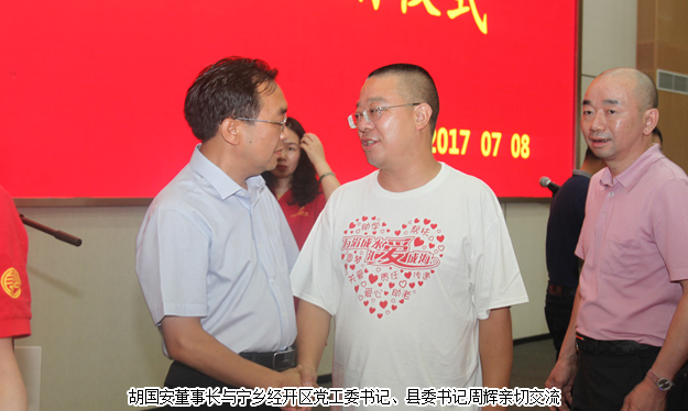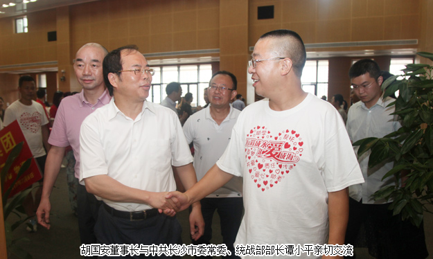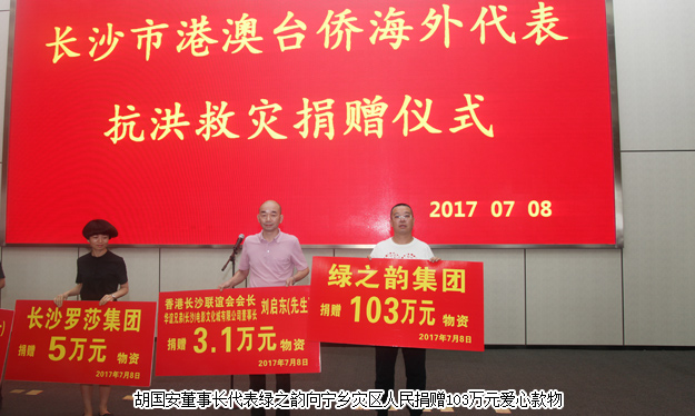 2017年7月8日,心連心、共命運(yùn)——長沙市港澳臺(tái)僑海外代表抗洪救災(zāi)捐贈(zèng)活動(dòng)在寧鄉(xiāng)舉行,中共長沙市委常委、統(tǒng)戰(zhàn)部部長譚小平,長沙市政協(xié)黨組織副書記、副主席石長松,中共長沙市委統(tǒng)戰(zhàn)部常務(wù)副部長劉映群,中共長沙市委統(tǒng)戰(zhàn)部副部長、市僑聯(lián)黨組書記王國平,中共長沙市委統(tǒng)戰(zhàn)部副部長、市臺(tái)辦主任袁義和等領(lǐng)導(dǎo)出席活動(dòng)。湖南省政協(xié)委員、香港湘都同鄉(xiāng)會(huì)名譽(yù)會(huì)長、長沙市海外聯(lián)誼會(huì)副會(huì)長、綠之韻集團(tuán)董事長胡國安,長沙市政協(xié)常委、香港長沙聯(lián)誼會(huì)執(zhí)行會(huì)長、善德集團(tuán)董事長張曉琴,湖南省綠之韻公益基金會(huì)秘書長蔣文、副會(huì)長胡武安等與數(shù)十名長沙市港澳臺(tái)僑海外代表企業(yè)家共同參與活動(dòng),并通過牽頭募捐和以身作則,共籌集619余萬愛心款物深入寧鄉(xiāng)重災(zāi)區(qū),希望幫助受災(zāi)群眾早日重建家園、恢復(fù)正常生活秩序。