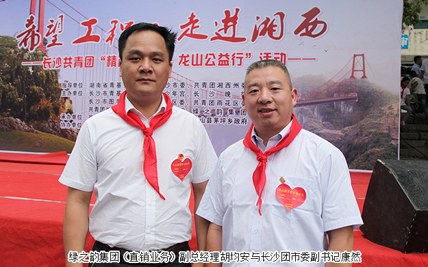 本次活動(dòng)是在湖南青基會(huì)、長(zhǎng)沙團(tuán)市委、湘西團(tuán)州委指導(dǎo)下,由長(zhǎng)沙青基會(huì)、長(zhǎng)沙市青少年宮、長(zhǎng)沙晚報(bào)、長(zhǎng)沙市圖書館、芙蓉團(tuán)區(qū)委、雨花團(tuán)區(qū)委、長(zhǎng)沙團(tuán)縣委、長(zhǎng)沙市衛(wèi)計(jì)委團(tuán)委、綠之韻集團(tuán)共同主辦;龍山團(tuán)縣委、龍山縣教體局、龍山縣茅坪鄉(xiāng)政府共同承辦。湖南青基會(huì)副秘書長(zhǎng)陳薇羽,長(zhǎng)沙團(tuán)市委副書記康然,湘西團(tuán)州委書記向汝蓮,中共龍山縣委副書記陳忠耀、縣委常委、組織部長(zhǎng)石紅梅、縣委常委、縣委辦主任符家波及相關(guān)單位負(fù)責(zé)人出席,綠之韻集團(tuán)(直銷業(yè)務(wù))副總經(jīng)理胡均安受邀參加本次活動(dòng)。