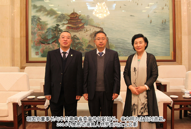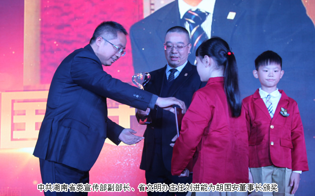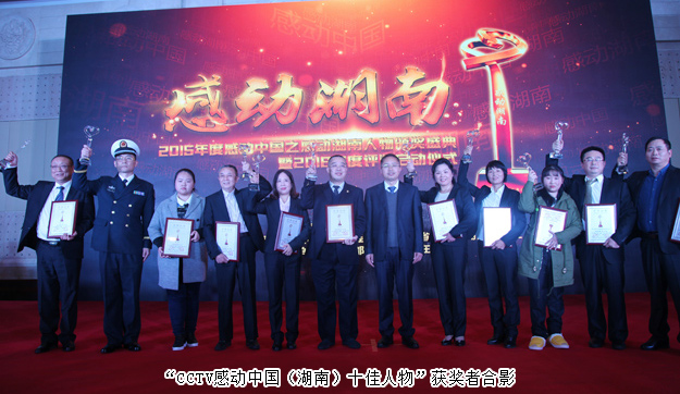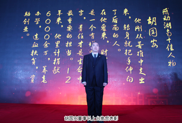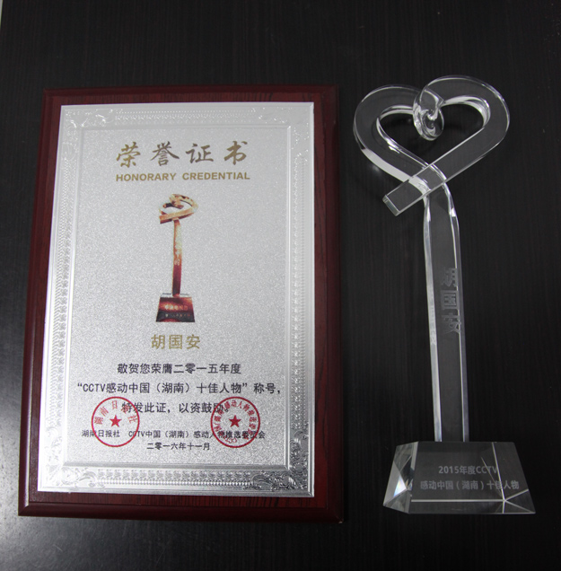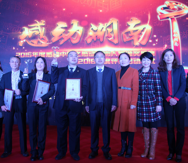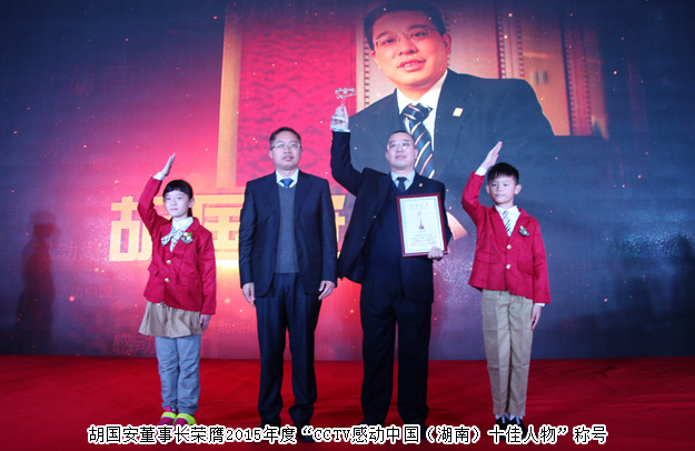 感動中國,感動湖南。2016年11月9日,由湖南省文明辦指導,湖南日報社、省總工會、省軍區(qū)政治部、團省委、省婦聯(lián)共同主辦,三湘都市報、華聲在線承辦的“2015年度感動中國之感動湖南人物”頒獎典禮在湖南省委九所賓館隆重舉行。湖南省人大常委會副主任李友志,省人大常委會委員、教科文衛(wèi)委員會主任委員梁爾源,中共湖南省委宣傳部副部長、省文明辦主任劉進能,省總工會黨組成員、副主席黃新民,省婦聯(lián)黨組成員、副主席魯華,湖南日報社黨組成員、副總編輯鄧獻忠,省軍區(qū)轉(zhuǎn)業(yè)辦主任吳湘波,省委宣傳部新聞處處長馮錦,省文明辦創(chuàng)建處處長張志輝,湖南日報社編委、三湘都市報總編輯、華聲在線常務副總裁張云夢,省總工會宣教部副部長羅偉,共青團湖南省委宣傳部部長陳麗等出席活動。綠之韻集團董事長胡國安獲評2015年度“CCTV感動中國(湖南)十佳人物”稱號,中共湖南省委宣傳部副部長、省文明辦主任劉進能為胡國安董事長頒獎。