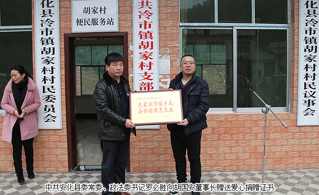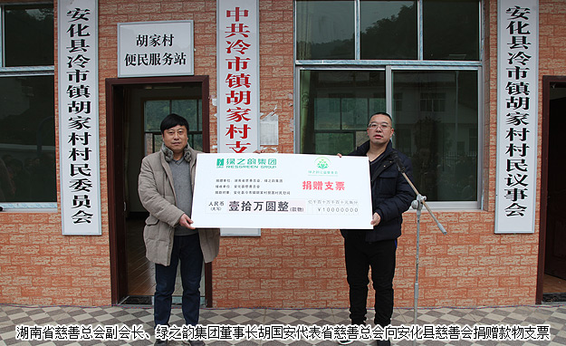 愛(ài)心慰問(wèn)活動(dòng)上,對(duì)胡國(guó)安董事長(zhǎng)致富思源、支援家鄉(xiāng)建設(shè)的高尚情操,對(duì)綠之韻集團(tuán)精準(zhǔn)扶貧、回報(bào)桑梓的大愛(ài)情懷表示高度的肯定和贊許;安化縣冷市鎮(zhèn)胡家村村支書(shū)胡利民簡(jiǎn)單介紹了胡家村相關(guān)情況。湖南省慈善總會(huì)副會(huì)長(zhǎng)、綠之韻集團(tuán)董事長(zhǎng)胡國(guó)安代表湖南省慈善總會(huì)向安化縣慈善會(huì)捐贈(zèng)10萬(wàn)元款物支票,中共安化縣委常委、政法委書(shū)記羅必勝向胡國(guó)安董事長(zhǎng)頒發(fā)了愛(ài)心捐贈(zèng)證書(shū)。儀式上,湖南省慈善總會(huì)副會(huì)長(zhǎng)、綠之韻集團(tuán)董事長(zhǎng)胡國(guó)安發(fā)表了飽含真情的講話(huà)。他在發(fā)言中表示,“一個(gè)企業(yè)能夠受到政府的關(guān)心、贏(yíng)得社會(huì)的信賴(lài),獲得民眾的尊重,一定離不開(kāi)對(duì)社會(huì)責(zé)任的思考、實(shí)踐和擔(dān)當(dāng)。安化胡家村是我的家鄉(xiāng),生我養(yǎng)我的熱土,生命之源,難忘之根。沒(méi)有胡家村,就沒(méi)有我,沒(méi)有綠之韻。我從這里的大山走出去,也想幫助更多人走出大山,過(guò)上幸福快樂(lè)的生活。綠之韻公益基金會(huì)除了繼續(xù)幫扶家鄉(xiāng)建設(shè)水、電、道路和學(xué)校等基礎(chǔ)設(shè)施,還將進(jìn)一步推動(dòng)輸血式扶貧向造血式、“互聯(lián)網(wǎng)+三農(nóng)”扶貧模式轉(zhuǎn)變,盡最大努力幫助解決安化扶貧的實(shí)際困難,幫助家鄉(xiāng)困難群眾建立脫貧希望,尋找致富方法,使企業(yè)發(fā)展成果惠及更多鄰里鄉(xiāng)親們!”