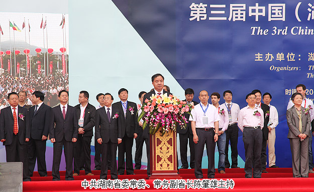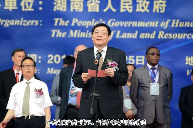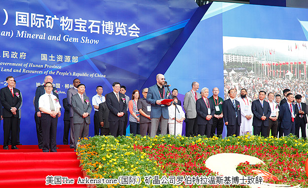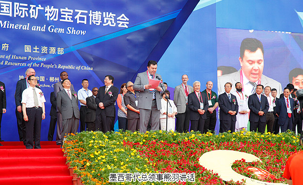 開幕式上,郴州市委書記易鵬飛、國外展商代表羅伯特?拉溫斯基、墨西哥代總領(lǐng)事熊羽分別致辭。美國圖森展原主席彼得?梅高、澳大利亞昆士蘭博物館聯(lián)盟主任蘇珊?米勒、美國著名礦物寶石收藏家基因?梅爾安等境外嘉賓,中國科學院院士莫宣學,國土資源部、湖南省委、省人大、省政府、省政協(xié)領(lǐng)導,國家相關(guān)部辦委領(lǐng)導,礦博會組委會成員單位領(lǐng)導,行業(yè)協(xié)會、礦山企業(yè)、參展商代表,50多家新聞媒體記者及群眾代表等參加了開幕式。