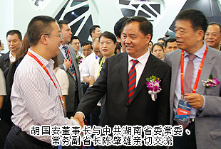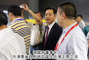 陪同領(lǐng)導巡館以后,胡國安董事長對本次礦博會成功舉辦高度評價:“國際礦博會的舉辦,讓‘湖南走出去’戰(zhàn)略得到了充實提升。這么多國家參展,必將吸引全世界的目光,這對于湖南文化和湖南經(jīng)濟社會來說,是一個天然的展示機會。湖南應充分利用博覽會搭建的平臺,‘把會展與文化、旅游、科技、信息、商貿(mào)、物流更好地結(jié)合起來,著力推動會展經(jīng)濟和現(xiàn)代服務(wù)業(yè)加快發(fā)展’”。他表示:湖南地處中國中部城市要沖,無論是地理位置還是區(qū)位優(yōu)勢來看,都是屬于發(fā)展要沖,加上洞庭湖國家級生態(tài)經(jīng)濟區(qū)和長江經(jīng)濟帶的確立,更突顯了湖南的發(fā)展優(yōu)勢。推動會展經(jīng)濟發(fā)展,這是現(xiàn)代經(jīng)濟發(fā)展的一個重要支撐,如果與湖湘文化和大湘西旅游資源及商貿(mào)物流進行融合發(fā)展,這就讓湖南經(jīng)濟具備了強大的內(nèi)生動力,為湖南改革開放提供了一個天然的通道和平臺。所以,我們既要關(guān)注這次郴州礦博會的盛況,更要與湖南未來的發(fā)展結(jié)合起來看,目光不限于一隅,思路才會天地闊。