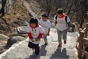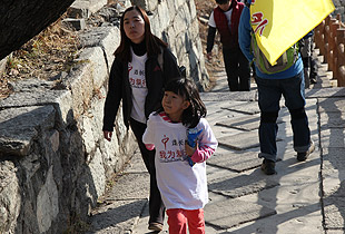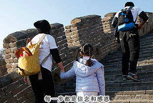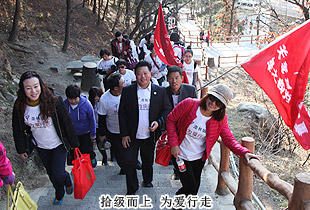 由于行進道路比較狹窄、坡度較大,大家三五成群,從慕田峪長城入口的中華夢石城出發(fā),沿著北步道,一路意志堅定,沿著幾里長陡峭的石階拾級而上,手拉著手歡呼雀躍地向著長城10號炮臺進發(fā)。在這條人流中,匯聚著綠之韻愛心經銷商、公務員、知識分子、企業(yè)老板、務工人員、學生……他們彼此并不相識,博愛的名義卻把他們緊緊連在了一起。相識的、不相識的,大家揮舞慈善紅旗,以眼神鼓勁,用微笑問候,朝著一個共同的夢想、共同的愛心、共同的追求徒步前行。共沐大愛的心靈長河,誰人又不被感動呢?