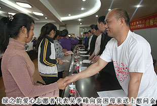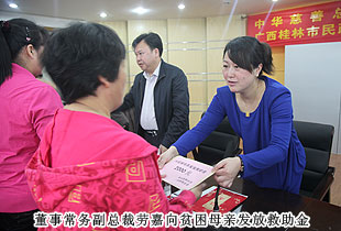 2014年4月11日,“關愛貧困母親,讓愛綻放”——中華慈善總會貧困母親救助綠之韻愛心行動第三站走進廣西桂林,為100名特困母親捐贈20萬元愛心善款。中華慈善總會秘書長邊志偉、募捐部主任蘇輝、廣西慈善總會常務副會長陳利丹、秘書長陳克富等領導出席活動。綠之韻集團董事常務副總裁勞嘉、全球營銷中心華南區(qū)業(yè)務總監(jiān)兼廣東分公司經理梁涌帶領吳季峰、葉海蘭、楊帆等綠之韻愛心志愿者為愛行動。