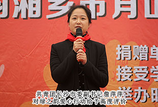 共青團長沙市委副書記詹萍萍指出:綠之韻集團作為共青團、青基會愛心理事單位,多年來以自己的實際行動承擔社會責任,值得尊敬和學(xué)習(xí)。傳承愛,發(fā)揚愛,未來我們將仍然緊密開展活動,給社會注入愛的力量。