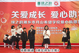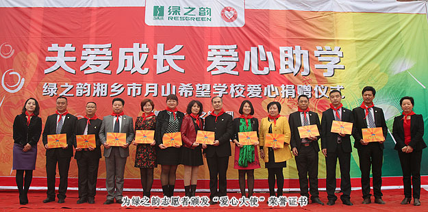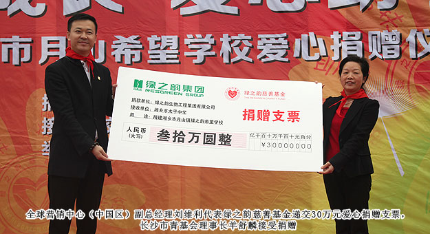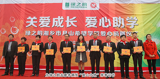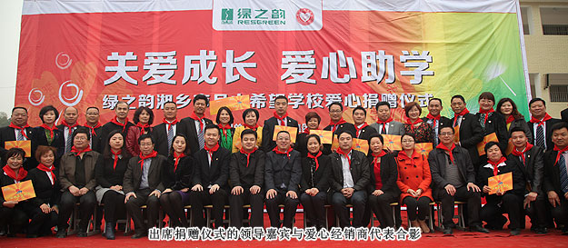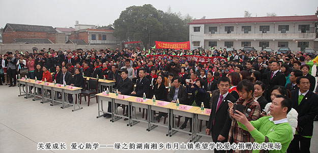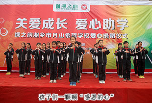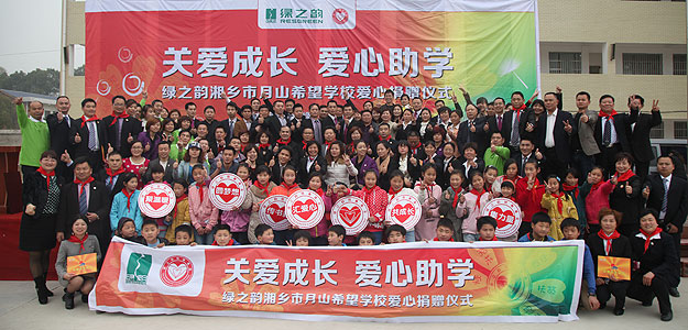 2014年3月19日,由共青團長沙市委、長沙市青基會牽頭,綠之韻集團出資30萬元建設(shè)的第九所希望學(xué)校——“綠之韻湘鄉(xiāng)市月山鎮(zhèn)希望學(xué)?!痹诤舷驵l(xiāng)市揭牌成立。共青團湘潭市委書記白云峰、共青團長沙市委副書記詹萍萍、湘鄉(xiāng)市人大常委會黨組副書記、副主任王建湘、長沙市青基會理事長羊舒麟、月山鎮(zhèn)常務(wù)副鎮(zhèn)長徐慧湘等十幾位領(lǐng)導(dǎo)嘉賓出席,綠之韻集團董事長胡國安、全球營銷中心(中國區(qū))副總經(jīng)理劉維利、湖南分公司經(jīng)理張薇與200多位綠之韻愛心經(jīng)銷商共同為愛傳承,為孩子們送上如春天般的融融暖意。
