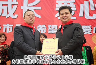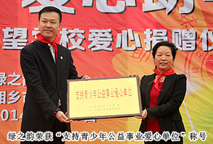 揭牌儀式上,月山鎮(zhèn)學(xué)校的學(xué)生們向出席儀式的綠之韻集團愛心人士敬獻了紅領(lǐng)巾。全球營銷中心(中國區(qū))副總經(jīng)理劉維利代表綠之韻慈善基金遞交30萬元愛心捐贈支票,長沙市青基會理事長羊舒麟接受捐贈,并授予綠之韻“支持青少年公益事業(yè)愛心單位”牌匾。共青團湘潭市委書記白云峰與綠之韻集團胡國安董事長共同為希望學(xué)校揭牌,并向胡國安董事長頒發(fā)了愛心企業(yè)家榮譽牌匾,各級領(lǐng)導(dǎo)嘉賓與愛心經(jīng)銷商代表全程見證。