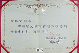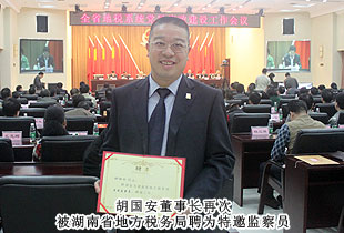 自2008年受聘,2011年連任湖南省地稅局特邀監(jiān)查員以來(lái),胡國(guó)安董事長(zhǎng)始終認(rèn)真履行職責(zé),了解和反映基層稅務(wù)部門和稅務(wù)人員依法治稅、依法行政的情況,在解決群眾關(guān)心的熱點(diǎn)難點(diǎn)問(wèn)題,促進(jìn)行風(fēng)政風(fēng)建設(shè)方面取得了矚目的成績(jī),得到了地稅系統(tǒng)領(lǐng)導(dǎo)的高度肯定和一致好評(píng)。此次會(huì)議,胡國(guó)安董事長(zhǎng)再一次被聘為特邀監(jiān)察員,成為唯一一位連續(xù)兩次受聘連任湖南省地稅局特邀監(jiān)察員的企業(yè)家。