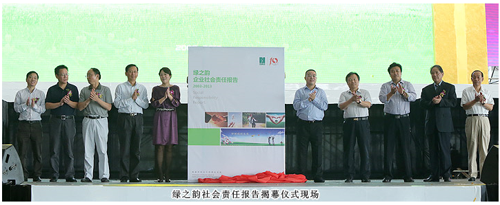 “行大道,民為本,立天下?!笔?,僅僅是個嶄新的開始。發(fā)布會上,綠之韻再次發(fā)布社會責(zé)任報告,胡國安董事長、董事常務(wù)副總裁勞嘉和蒞臨現(xiàn)場的領(lǐng)導(dǎo)嘉賓上臺為《綠之韻2003—2013年度企業(yè)社會責(zé)任報告》進行揭幕儀式,贏得了臺下家人們一陣陣熱烈的掌聲。