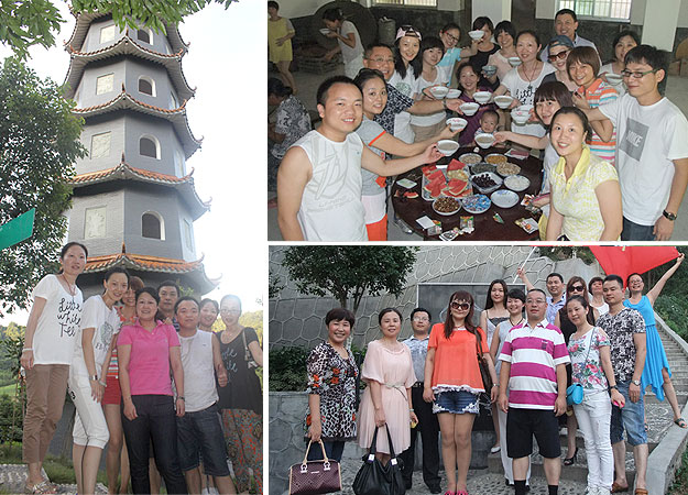 湖南省安化縣冷市鎮(zhèn)小九溪村,胡國安董事長的家鄉(xiāng)。大巴車沿著胡國安董事長為家鄉(xiāng)捐資修建的水泥路蜿蜒前行,深掩在崇山之間的“綠韻山莊”讓大家充滿期待。從一間木質(zhì)結構的小房屋,到三棟主樓聳立的大宅院,這里面包含著胡國安董事長成功的縮影。下了車,大家紛紛駐足在綠韻山莊平面示意圖前,樂開了鍋。這哪是家宅?分明就是一個度假村。明珠觀音塔、明珠閣、長城、怡然亭、游泳池、健身園、野生獼猴桃園……一整座山,構成了綠韻山莊,也承載了董事長為家爭光的夢想。